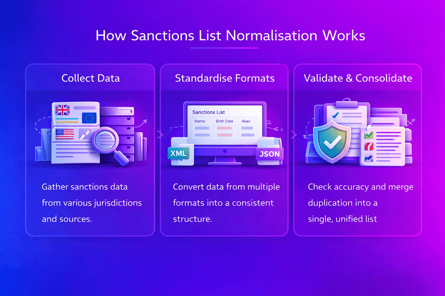 Sanctions list normalisation occurs before any screening takes place. It prepares watchlist data so that screening engines can perform accurate comparisons.