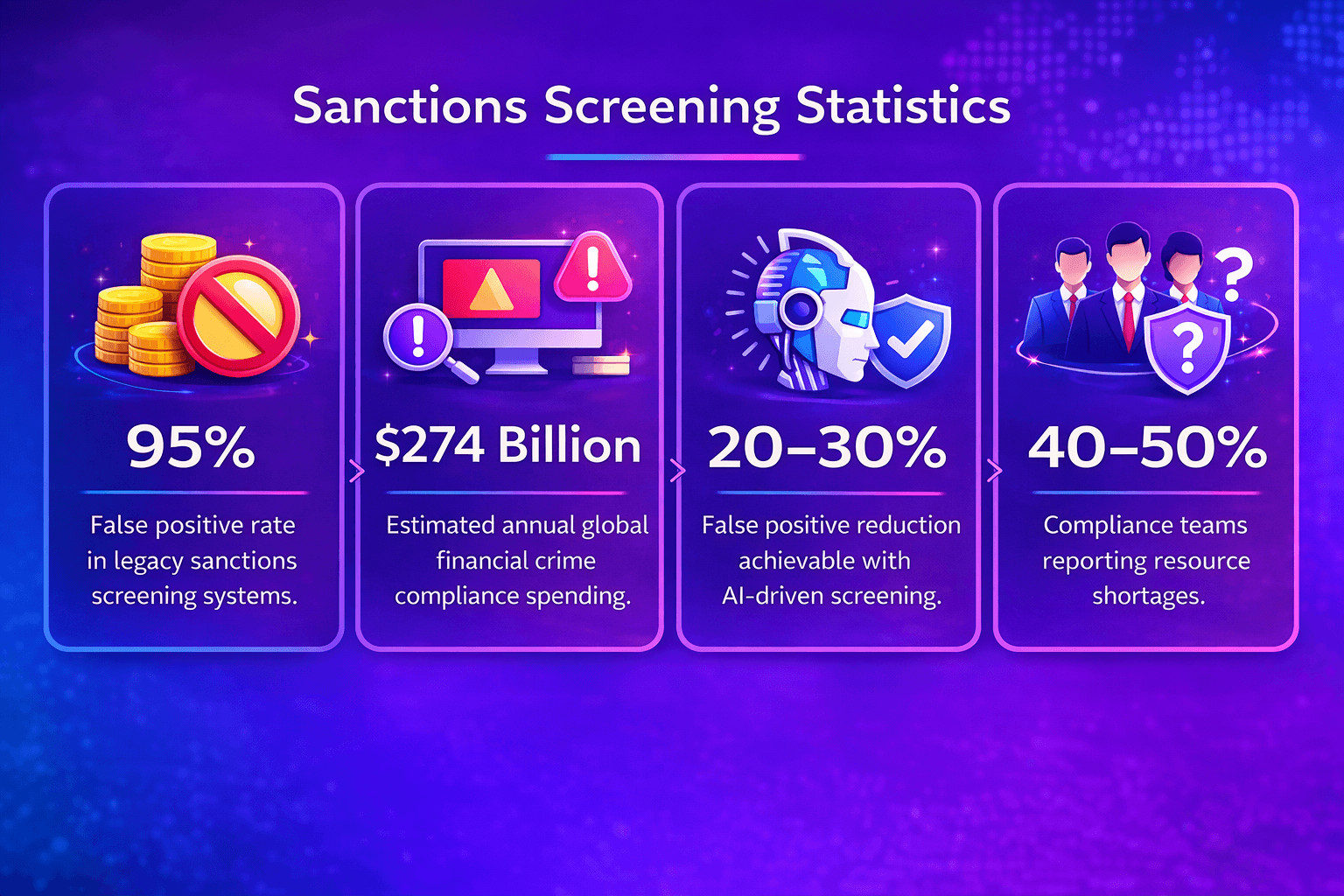 Sanctions screening statistics highlight the operational scale of financial crime compliance. Large volumes of alerts, rapidly evolving sanctions programmes, and complex international payment systems create significant challenges for financial institutions.