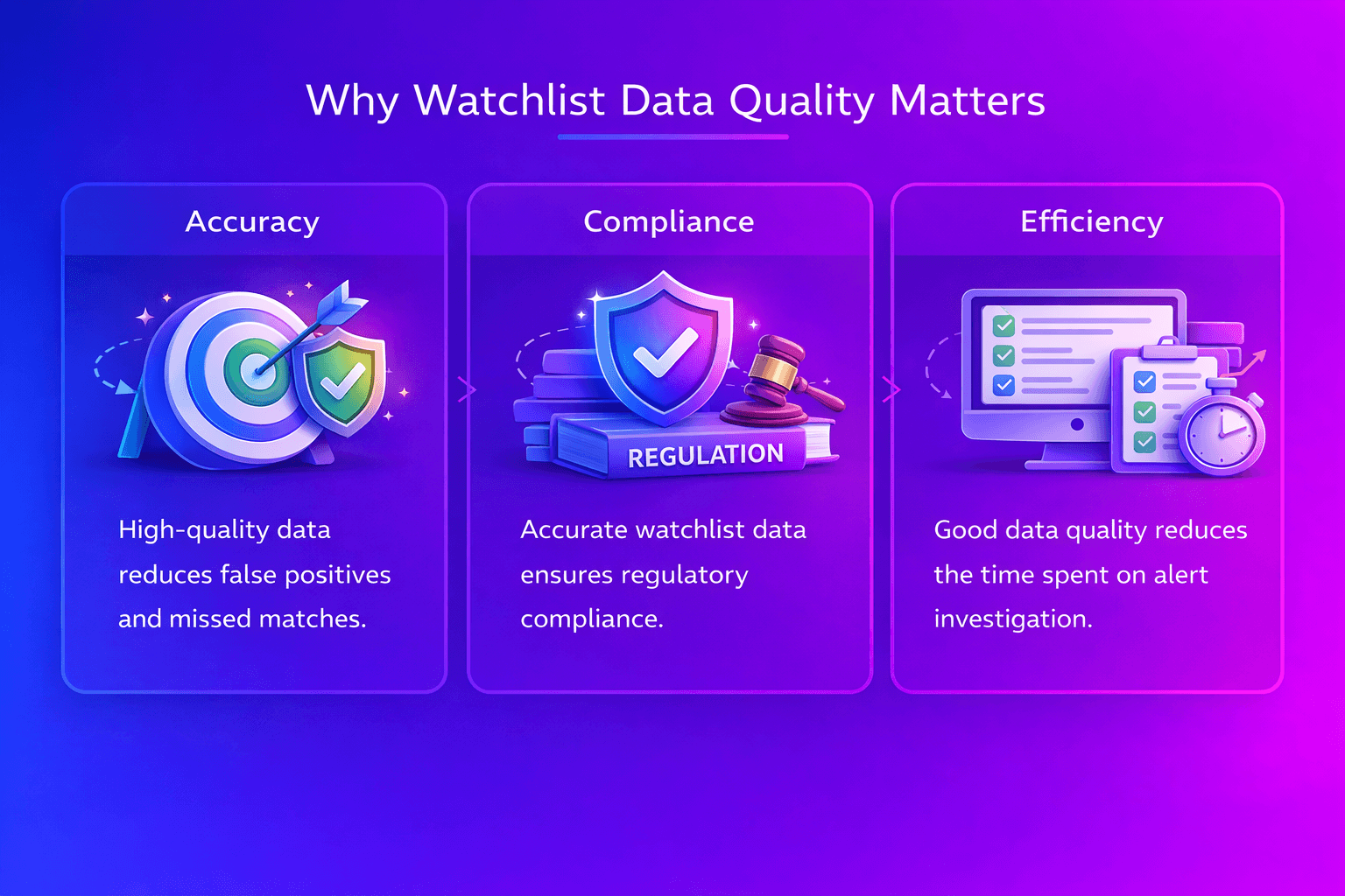 Watchlists contain the sanctioned individuals, entities, and jurisdictions that screening systems must detect. If this data is incomplete, inconsistent, duplicated, or poorly structured, the screening system will struggle to identify genuine matches accurately. This can lead to excessive false positives, missed risks, and inefficient investigation workflows.